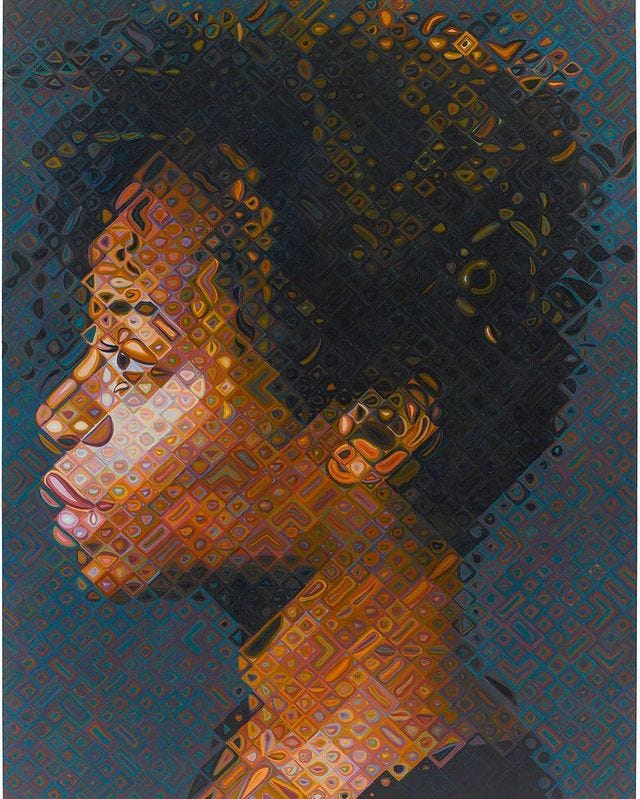 In a similar way, one could say that portrait artists Chuck Close and Alex Katz play with color as a type of hyperreal quality to a person. Whilst this portrait above of artist Kara Walker is at once abstract and true to life in a recognizable fashion, his signature use of squared color designs on a grand scale give her a kind of vibrancy and life force almost more visceral than a person in the flesh (though I have never met Ms. Walker myself — who knows?).