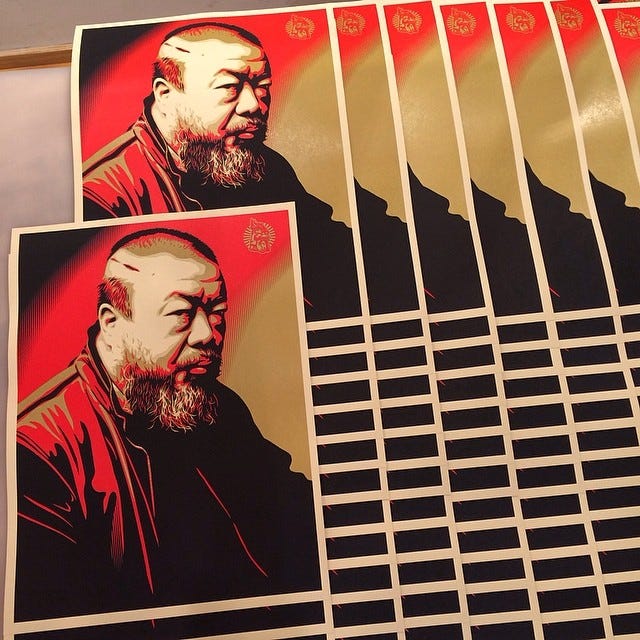 Shepard Fairey created a print which articulated the artistic expression of Gao Yuan’s photograph depicting Ai Weiwei with a visible scar and Fairey’s devotion to spread socio-political commentary on the current situation in the world of art and activism. The Chinese artist’s scar was obtained due to a head injury inflicted by the Chinese police in Chengdu in 2010.