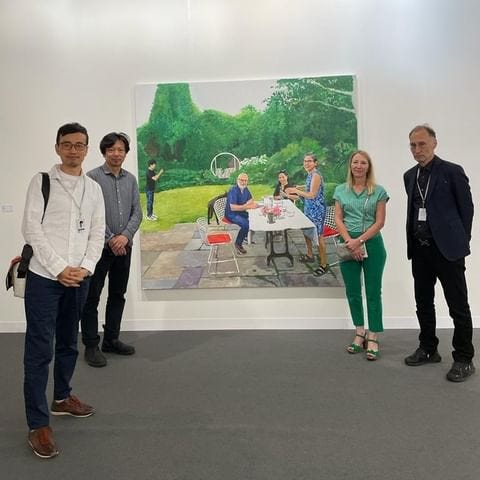 The Chinese artist working mainly in London depicted many ideas in a single image, a portrait of four people. The three at the forefront gaze at the portraitist as if posing or at least aware of their ‘capture.’ The man at the back with a camera is seemingly unaware, and creating his own art. The effect is one of disconnect — insider/outsider, different perspectives — but also one of space. The foreground and background, already aesthetically and geometrically enhanced, are more complex through the competing narratives of the picnic meal, albeit one on a table (no doubt a reference to English culture) and of the photographer who is either appreciating the garden itself or has spotted something - an animal? someone playing hide and seek in the bushes?. Is he photographing because he feels excluded or is it his way of remembering, filtering, and framing the beauty around him?