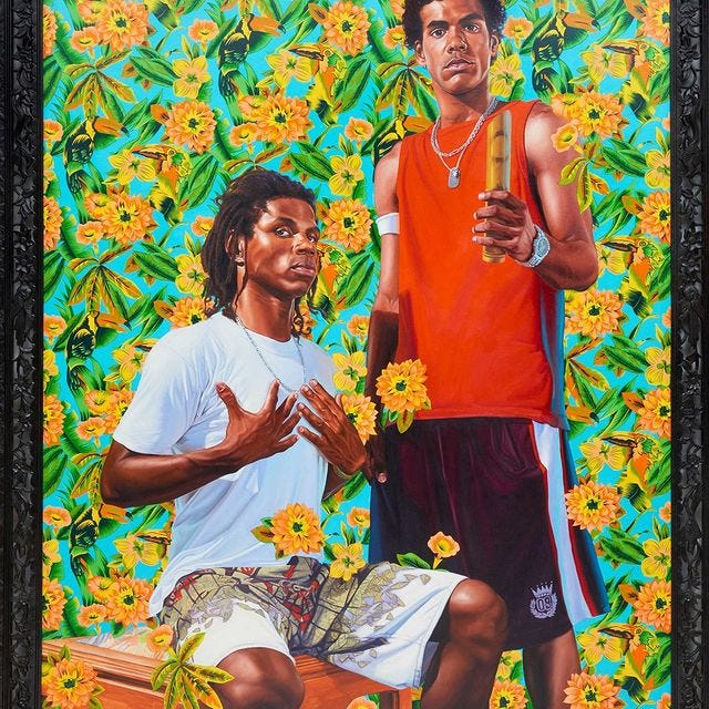 Los Angeles native and New York based visual artist, Kehinde Wiley has firmly situated himself within art history’s portrait painting tradition. As a contemporary descendent of a long line of portraitists, including Reynolds, Gainsborough, Titian, Ingres, among others, Wiley, engages the signs and visual rhetoric of the heroic, powerful, majestic and the sublime in his representation of urban, black and brown men found throughout the world.
