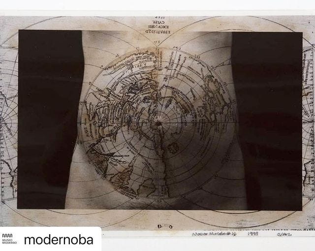 Also exhibited at MOMA this fall as part of a different show — “Our Selves: photographs by women artists from Helen Kornblum” — is Tatiana Parcero. She is a Mexican photographer working primarily with self portraits. Her work places body and nature, as well as drawings from ancient civilizations and colonial mapping, in the same frame and even put in physical interaction as an overlay on her body. Here is a link to further reading in Spanish from Deborah Dorotinsky Alperstein that places her work within a cultural context.