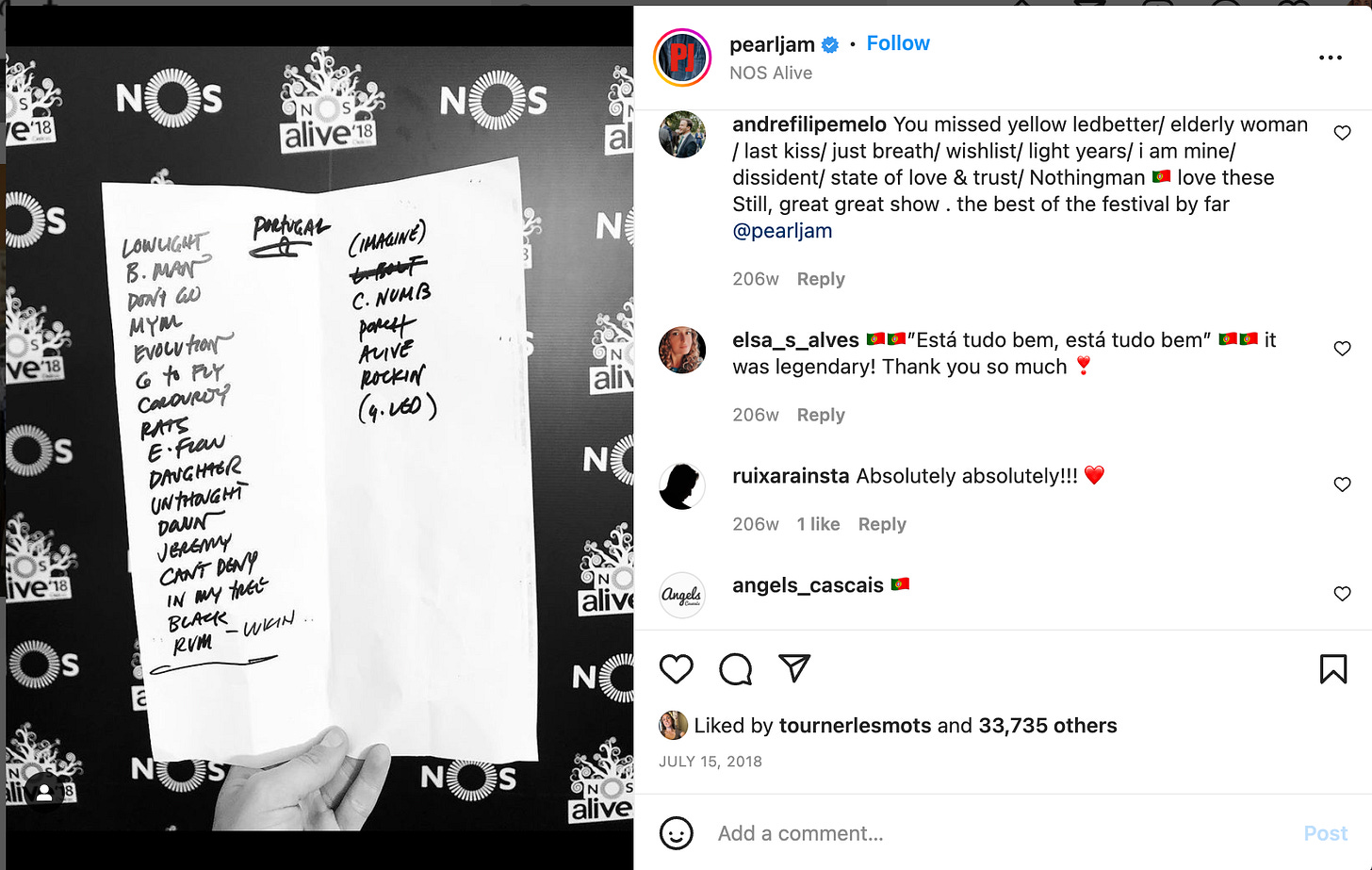 But there was living music, too. Pearl Jam—how many times did we listen to Yellow Leadbetter (many call it a homage to Hendrix) and air guitar or pretend to know the lyrics without lyric-finder?—I was going to move on, but let me stay with this song a moment! I finally got a chance to see Pearl Jam live at the NOS Alive festival in Lisbon with a surprise appearance from Jack White (starting with a cover of John Lennon’s Imagine). It was incredible…but in respect for the festival providers, they stopped after five encore songs and posted the playlist later…including an unplayed parenthetical final encore: Yellow Ledbetter. Gutted. At least it’s an excuse to see them again.