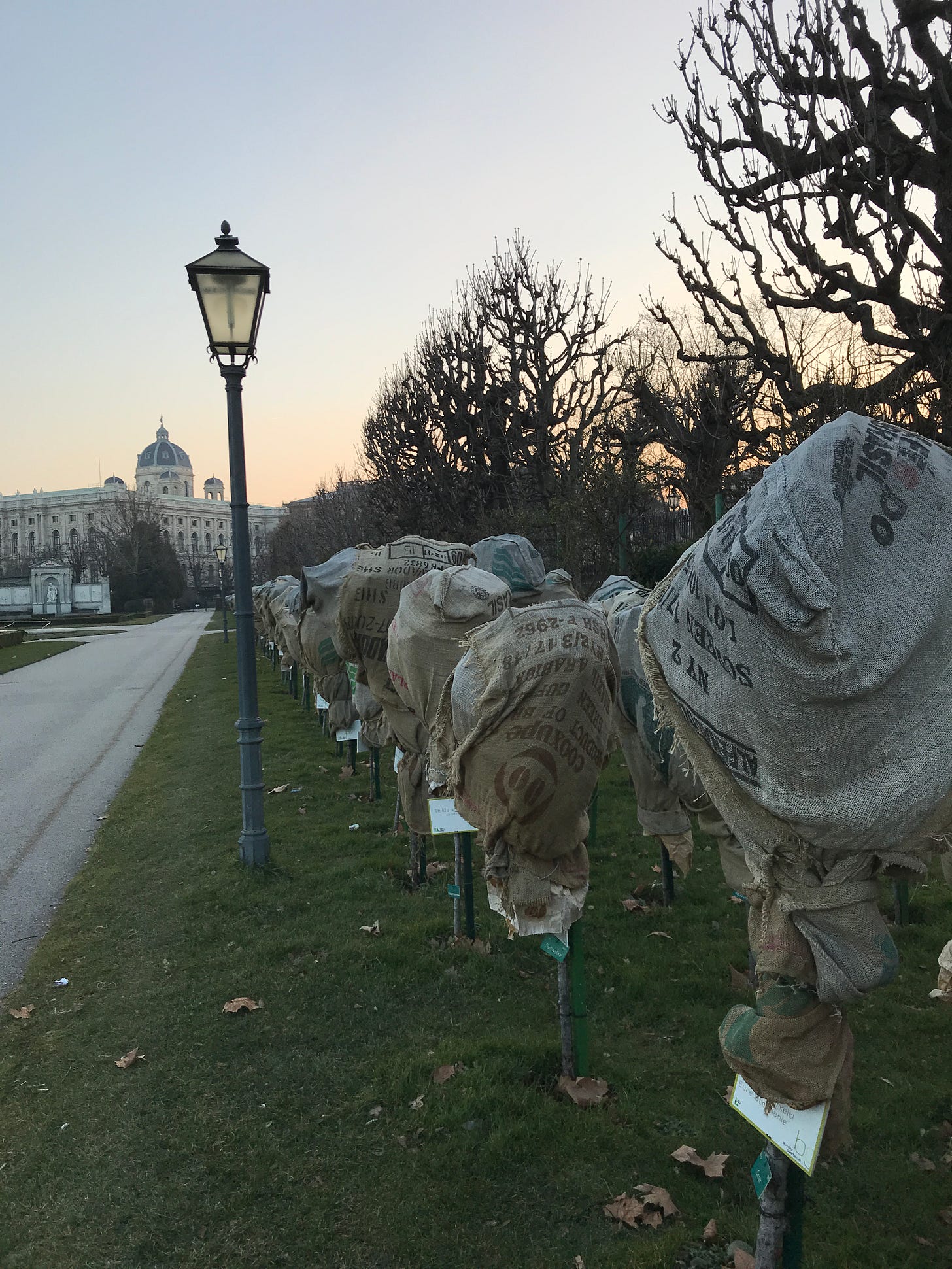 As she entered the park, alone, save a few early walkers and gardeners, she was struck by the winter fate of the rose bushes. Someone had covered their heads with burlap sacks. They were standing victims of a crime, lined up beside the winding paths. She could still see the shapes of their unique branches being crushed by the covering. Underneath, she imagined they were afraid, their colours were blocked or gone. And on the main stalk, each bush held a sign of a person’s name or a quote. Reminders of the dead. She wondered who these dead were and if the shapes of their bodies would have matched the outlines of the burlap sacks.