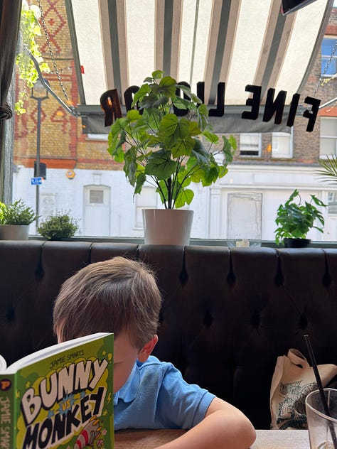 Saturday, I took my son on a date. He’s six and he likes impromptu adventures. After decadent pastries and a walk through the Japanese garden at Regent Park (and mandatory stop at the playground), I took him to one of my favorite bookstores: Daunt in Marylebone (a gorgeous village-y part of London between Hyde and Regent parks). I love it there. It makes me feel serenely happy. I never go with an agenda but this time there was one: to show him my bookshop, to let him choose a book.