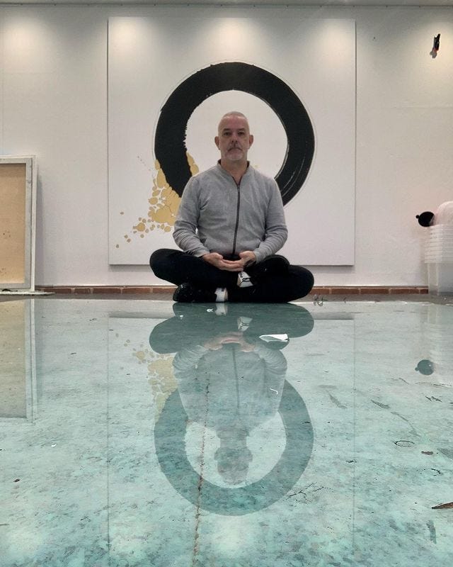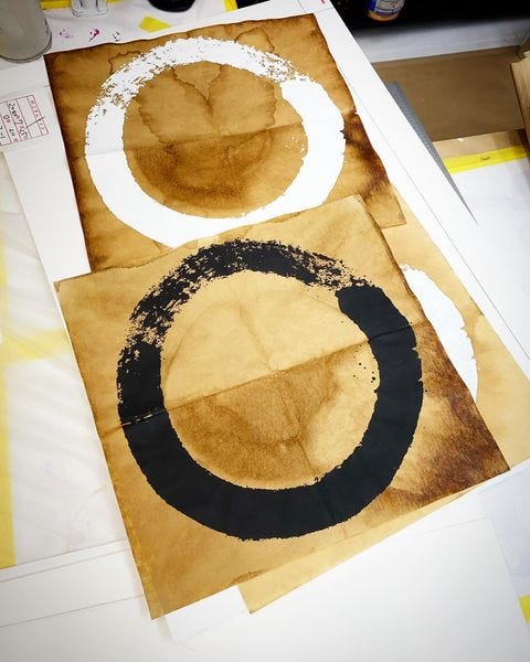 A couple years ago, he turned to the Ensō as a source of inspiration for his work, either painting it on its own or as part of a greater project. He also created a book of many of the works, including explanations of his inspiration - personal, philosophical, and aesthetic. The below work called ‘Exponentially Expanding Universe’ is included in the book.